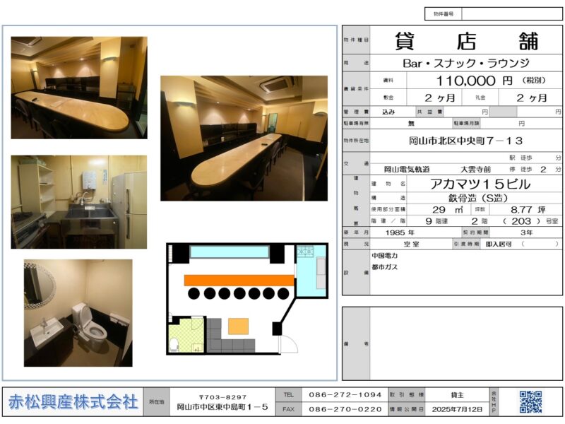 赤松興産の「Bar・スナック・ラウンジ」「店舗・テナント」「アカマツ15ビル 203号|賃貸物件」です