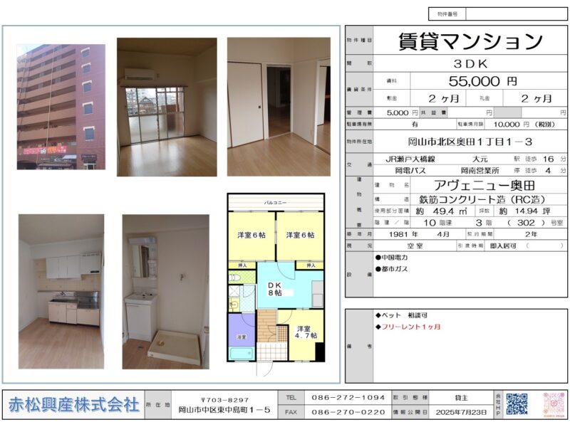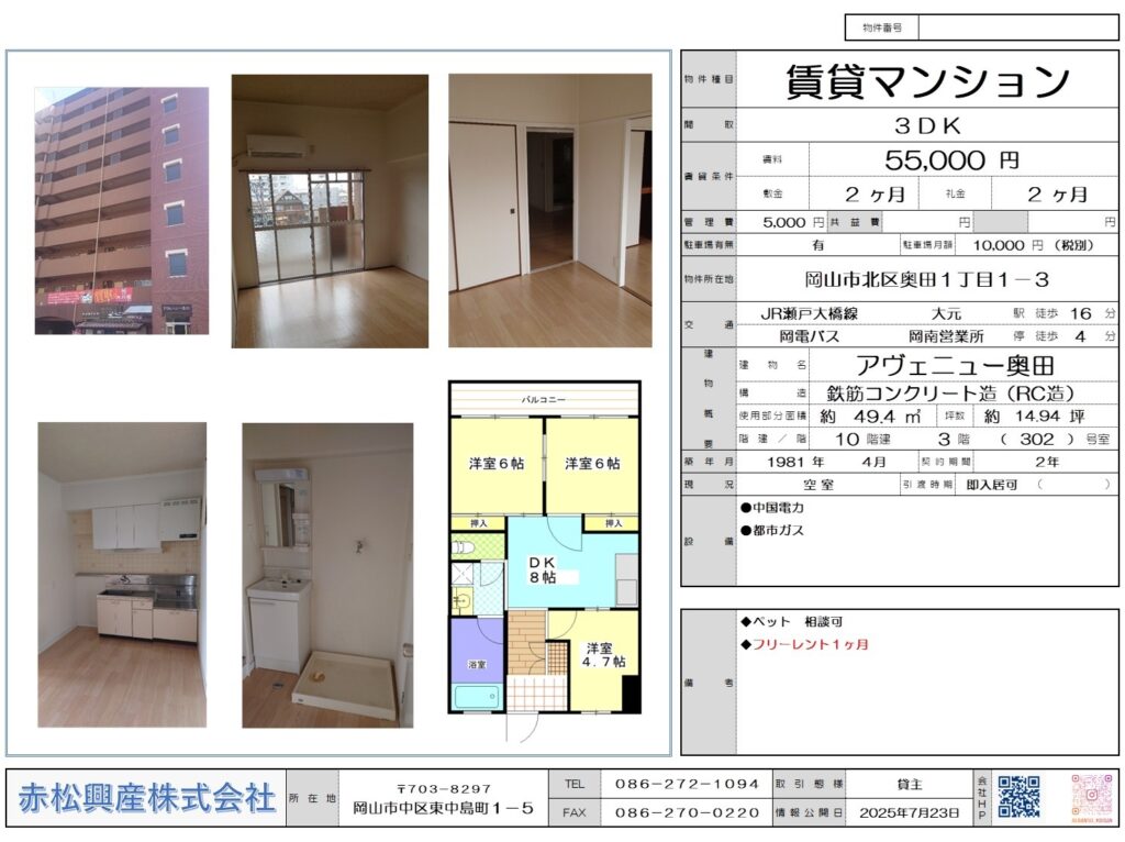 赤松興産の「ファミリー向け物件」「マンション・アパート」「アヴェニュー奥田 302号|賃貸物件」です