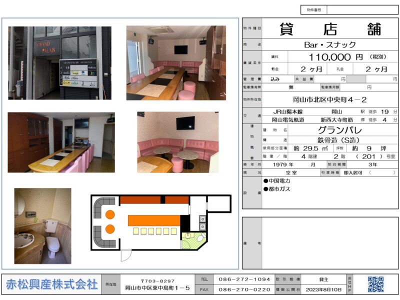 赤松興産の「Bar・スナック・ラウンジ」「店舗・テナント」「グランドパレス 201号|賃貸物件」です
