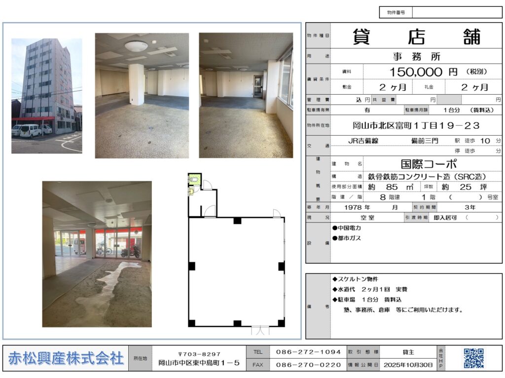赤松興産の「事務所・店舗」「店舗・テナント」「国際コーポ 1階 店舗|賃貸物件」です