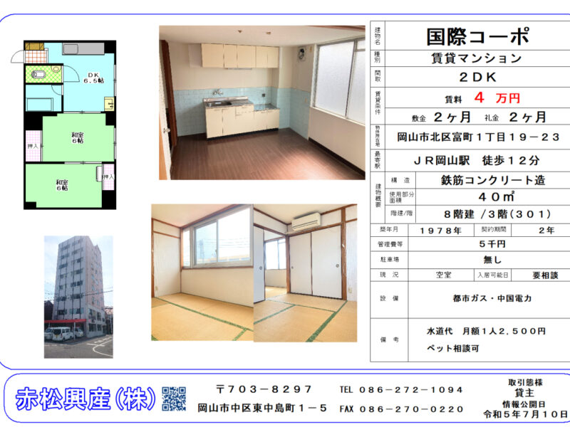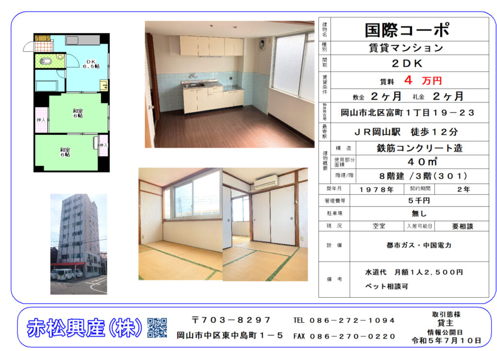 赤松興産の「ファミリー向け物件」「マンション・アパート」「国際コーポ 301号|賃貸物件」です