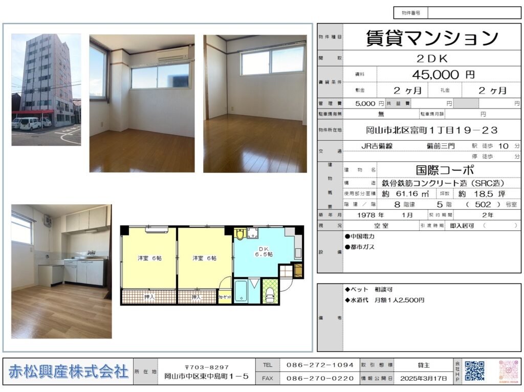 赤松興産の「ファミリー向け物件」「マンション・アパート」「国際コーポ 502号|賃貸物件」です