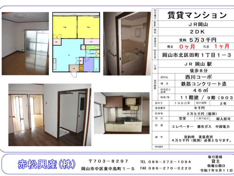 赤松興産の「ファミリー向け物件」「マンション・アパート」「西川コーポ 903号|賃貸物件」です