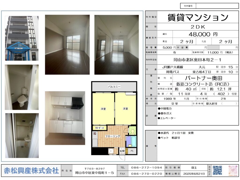 赤松興産の「ファミリー向け物件」「マンション・アパート」「パートナー奥田 402号|賃貸物件」です