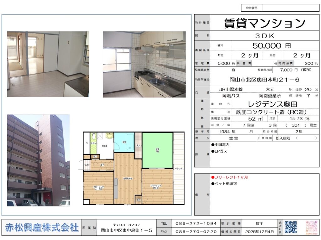赤松興産の「ファミリー向け物件」「マンション・アパート」「レジデンス奥田 301号|賃貸物件」です