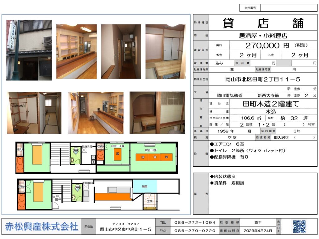 赤松興産の「飲食店向け物件」「店舗・テナント」「田町木造2階建て|賃貸物件」です