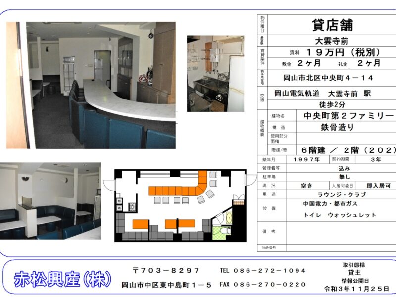 赤松興産の「Bar・スナック・ラウンジ」「店舗・テナント」「中央町第2ファミリービル 202号|賃貸物件」です