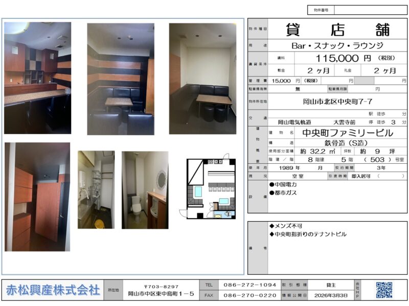 赤松興産の「Bar・スナック・ラウンジ」「店舗・テナント」「中央町ファミリービル 503号|賃貸物件」です