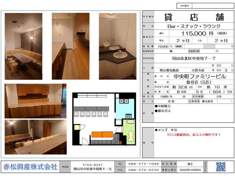 赤松興産の「Bar・スナック・ラウンジ」「店舗・テナント」「中央町ファミリービル 504号|賃貸物件」です