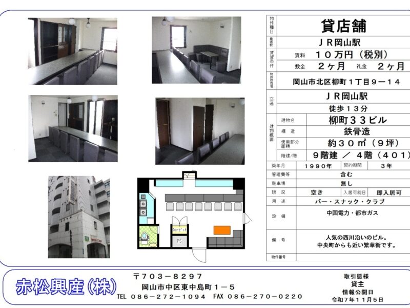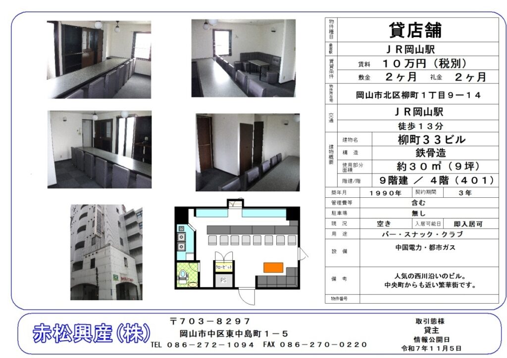 赤松興産の「Bar・スナック・ラウンジ」「店舗・テナント」「柳町33ビル 401号|賃貸物件」です