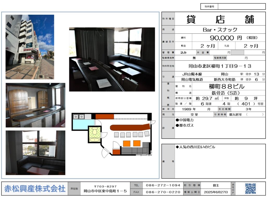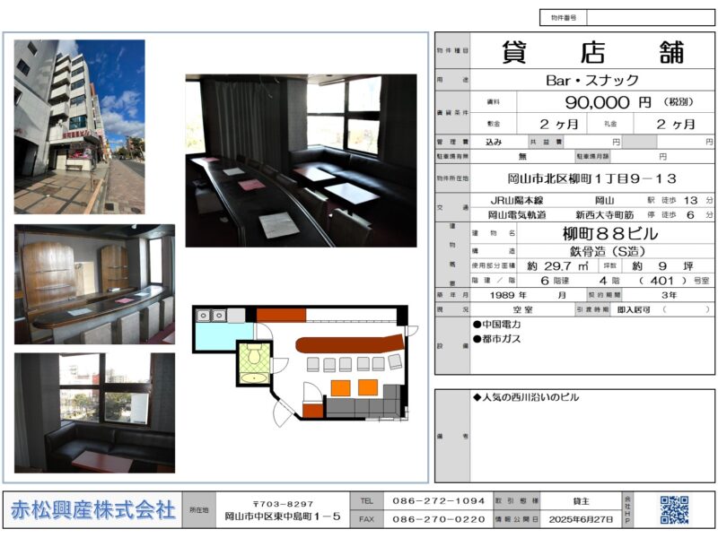 赤松興産の「Bar・スナック・ラウンジ」「店舗・テナント」「柳町88ビル 202号|賃貸物件」です