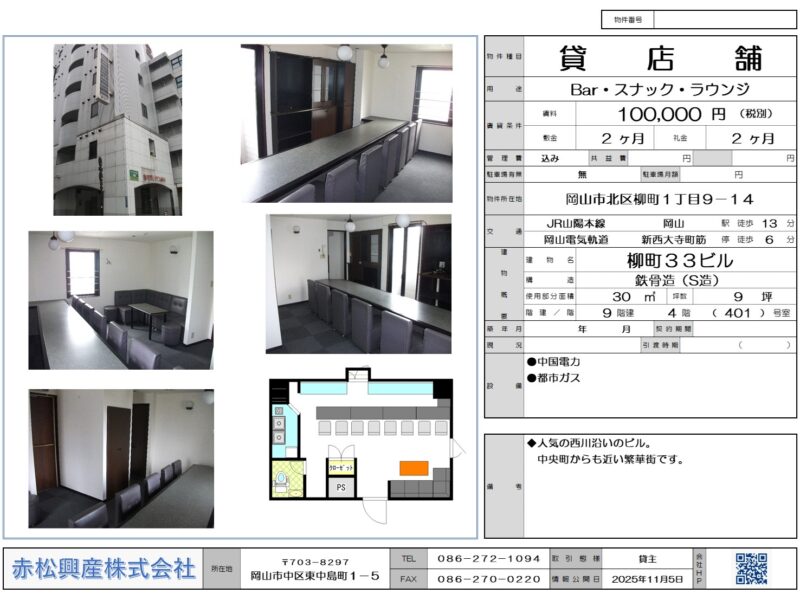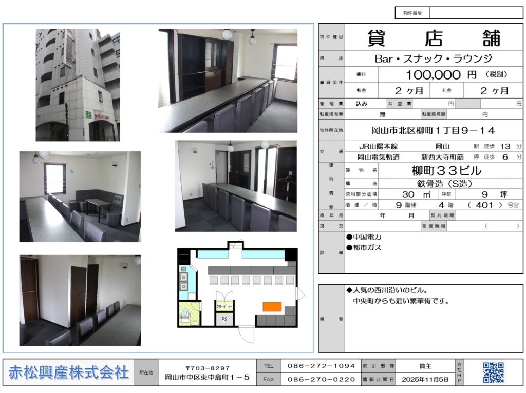 赤松興産の「Bar・スナック・ラウンジ」「店舗・テナント」「柳町88ビル 401号|賃貸物件」です