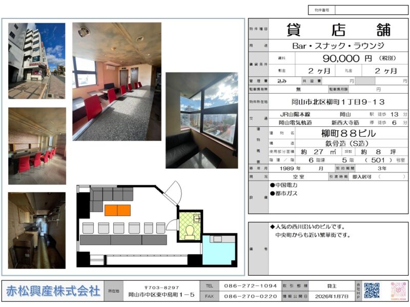 赤松興産の「Bar・スナック・ラウンジ」「店舗・テナント」「柳町88ビル 501号|賃貸物件」です